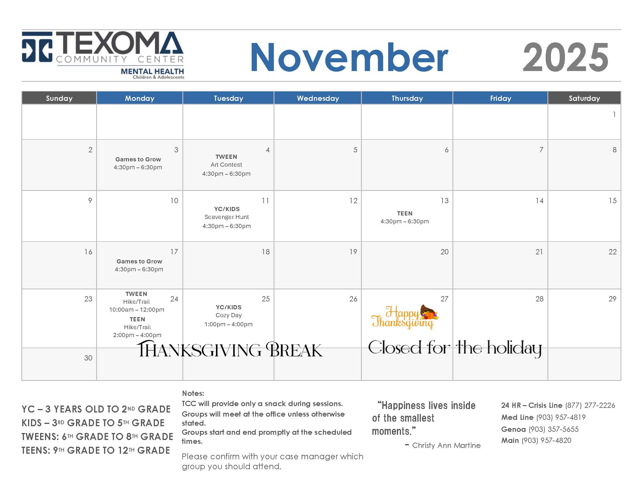 The Child and Adolescent Mental Health Services program offers comprehensive mental health services to children ages 3 to 17 who currently reside in Fannin, Grayson, or Cooke Counties.