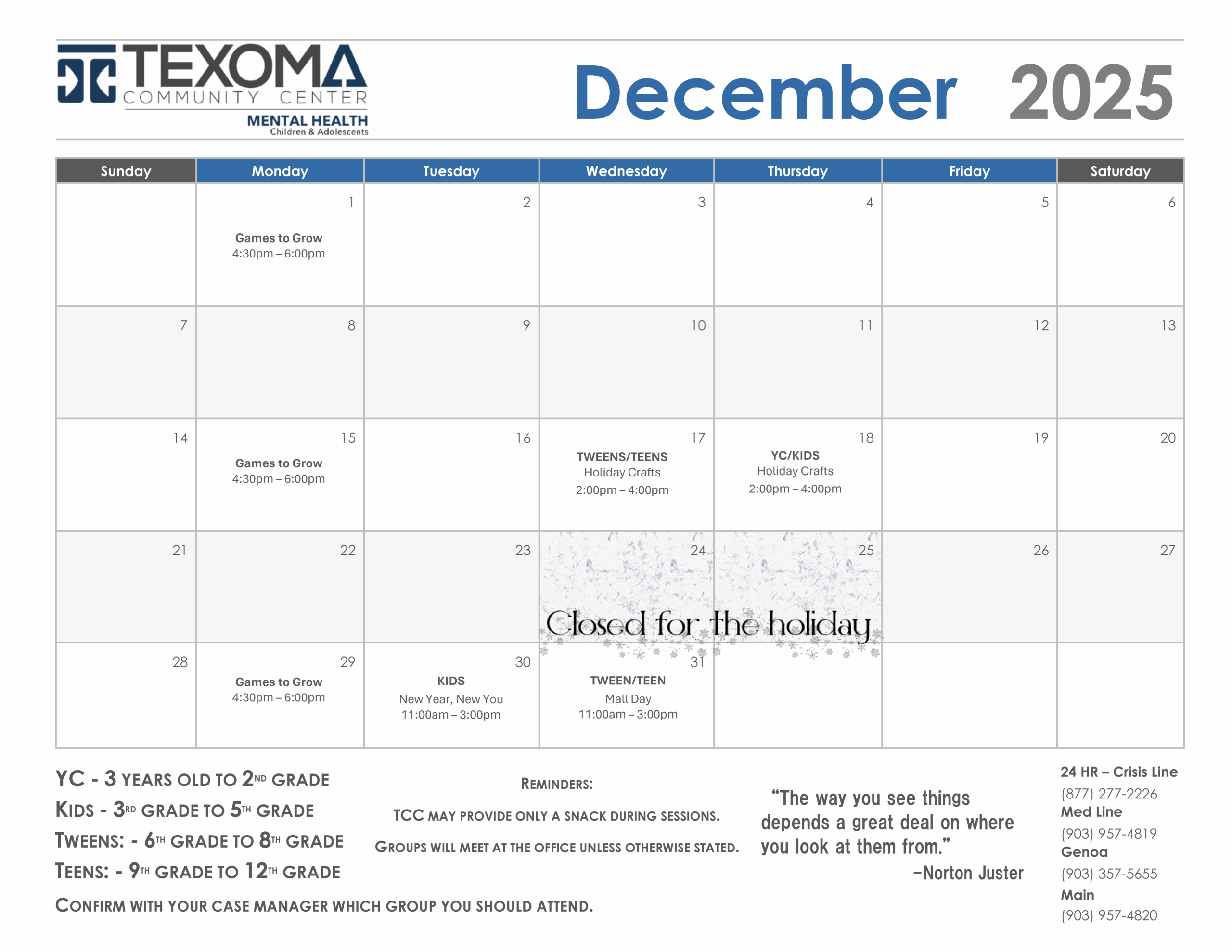 The Child and Adolescent Mental Health Services program offers comprehensive mental health services to children ages 3 to 17 who currently reside in Fannin, Grayson, or Cooke Counties.
